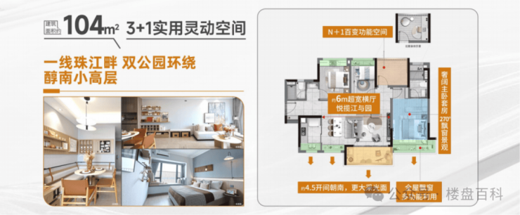 105m²大横厅,25方客餐厅一体,超4米一线江景开间,17方主人房大套间,3间次卧7-10方;