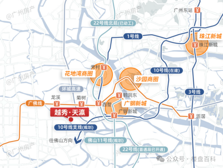 地铁——离现成开通的广佛地铁1号线菊树站直线距离2公里左右,骑行导航2.6公里8分钟车程,龙溪站也差不多距离;广州地铁1号线西塱站需要十来分钟;规划中的广州地铁10号线支线站点在项目附近;