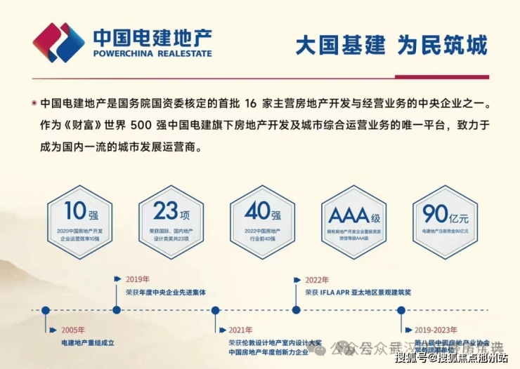 中国电建地产是中国电力建设集团的全资子公司,全国地产行业前 50 强,是国务院国资委批准的首批 16 家央企地产企业之一,同时拥有房地产开发企业壹级资质,资信等级 AAA 级,注册资金 90 亿元。中国电建地产已在北京、上海、广州、深圳等 32 个城市开发运营 140 余个地产项目。
