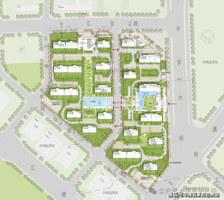 项目用地分为两块,28#地位于左侧,2.26公顷。29#地位于右侧,2.43公顷,两块地差不多大小。中间被一条15米宽的道路隔开。刚才说了那么多项目的好的方面,现在也说说劣势。首先两块地都不大,2万多平米,住宅满打满算也到不了5万平,规模一般,规划上要么楼栋较少(布置高层),要么楼座较密(布置洋房),反正一般吧。另外就是地块南边的35#37#地都是商业地块,加之东侧的平安大街是50米宽的城市主干道,这两侧为了会有一定程度的视线和噪音干扰。日照肯定没事啊,能审批过肯定就是计算过的合法的。但是日照是日照,采光是采光。