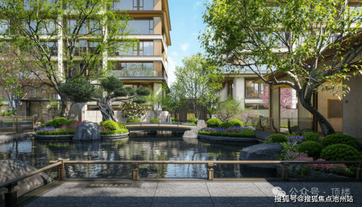 红线外滨河的重金投入:璟园以约500米滨水步道贯穿南北双地块,形成「一轴一环两园」的生态格局。这条滨水脉络不仅是社区的景观中轴,更通过四大主题空间(垂钓台、亲水步道、水榭茶寮、观景平台)与园林十六景深度联动,让「出门见河、推窗见景」成为日常。