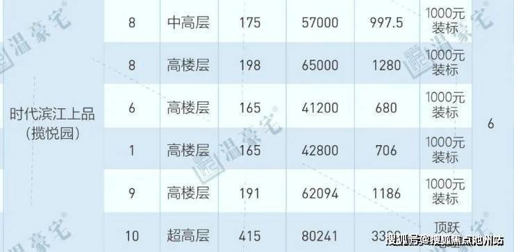 小区一共三个地块,滨江上品(揽悦园)是先开盘的,于2019年8月-2020年1月,共开盘3期,推售960套房源,主力面积段约132-260㎡,开盘毛坯均价约3.3-5万元/㎡。装标为1000元/㎡,赠送。