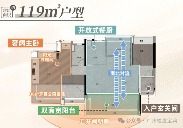 建面121平四房,带独立入户空间,五开间朝南,全屋南北对流,主卧带步入式衣柜,还有360°公园景观。