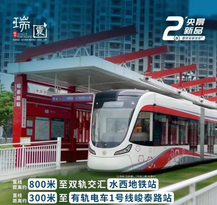 楼盘直线800米左右是7号线二期跟21号线的交汇站点水西站,直线300米范围内有轨电车1号线峻泰路站