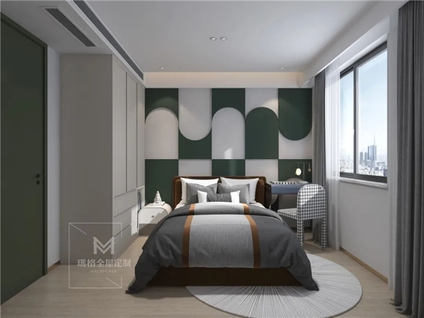 儿子房的背景墙使用了绿白圆弧色块拼接装饰,衣柜色彩使用了太空灰,经典不过时,时尚又不失童趣,这种色系风格可以沿用很久,十分实用。