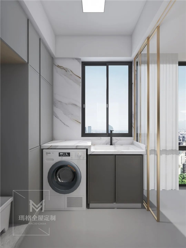 阳台的两侧墙体都设计了收纳柜,大大地增加了储物空间,可以存放拖把、吸尘器等清洁用具。洗衣机放在阳台,即洗即晒,同时还有柜子收纳,可以暂时存放收取的衣物,省去衣物的来回搬运路程,十分方便。