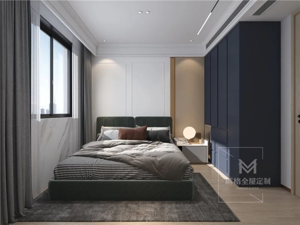 长辈房相对来说比较简约,没有过多繁复的设计,空间色系相对沉稳深邃,没有过度跳跃的亮色,衣柜采用佩斯深蓝色调,整体色调和谐统一,不扎眼,不哗众取宠。窗户大面积采光,让空间透亮不压抑。