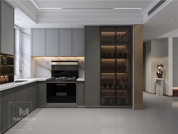 开放式的厨房一体化,与进餐区之间并没玻璃门之类的阻隔,方便备餐时与亲朋好友的交流,共享好“食”光。灶具旁设计了一柜到顶、带有黑玻璃的收纳柜,方便清洁之余,还增加了美观度。闲暇时光,业主夫妻可以品美酒尝美食,静静地享受美好的两人世界。