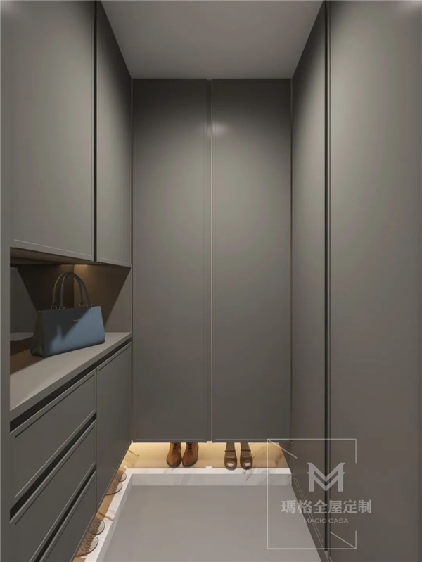 灰色为主体的玄关柜呈U型,虽然面积不算大,但底部镂空至少10cm的设计可以放置常穿的鞋子,出入换鞋一步到位;而中部的镂空设计也可以放置包包、钥匙等物件,通道留出大概90cm,走动不受阻碍。