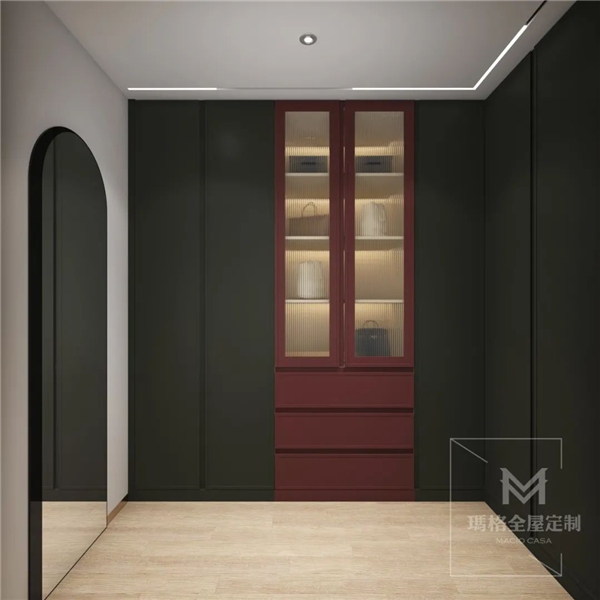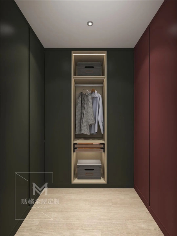 男女衣帽间按颜色分区设计,暗夜绿和海棠红的搭配,营造了复古浪漫气息,也满足了业主对颜色设计的要求。以一墙之隔,分开使用,充分保证私密性。两个衣帽间中部皆有镂空设计,更方便日常存取衣物,女衣帽间还装有玻璃柜门,内设柔和灯光,防尘易于清洁之余,更有装饰的作用。