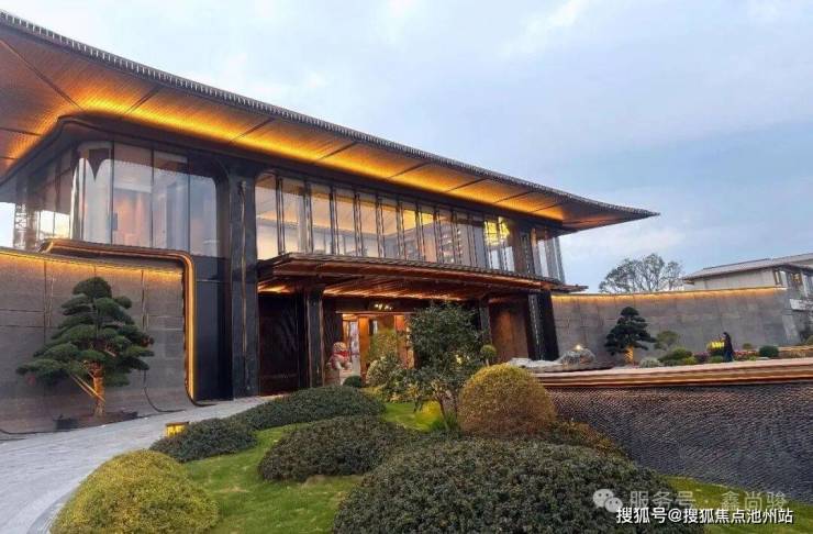恢弘府门立于瓯江畔,东方展翼飞檐取意《十二水图》“层波叠浪”,苍松迎客照壁浮光映门庭盛景,为归家铺就尊崇仪式感。