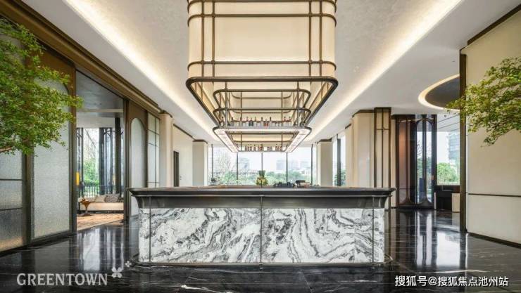 伫立首层大堂入口,抬眼是底部透光的悬挑式空中泳池,俯首是下沉庭院水景。飨湖私宴厅、饮湖茶室等,亦与水岸、空中旋梯景致交融。