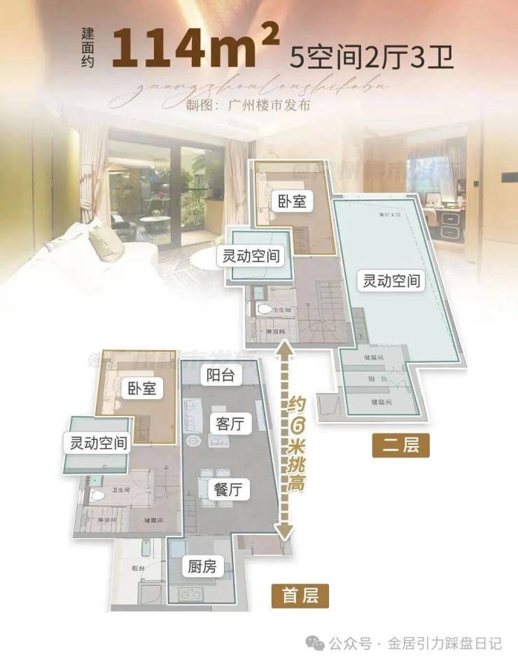 复式总价≈同功能平层价格省100万+(例:114㎡复式≈163㎡平层功能)。