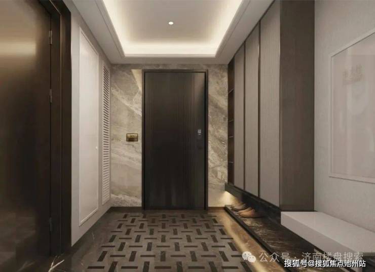 首创aman落尘区,电梯厅与室内装修同频设计,通过外置入户更衣区与收纳系统,从外到内完成无缝切换。