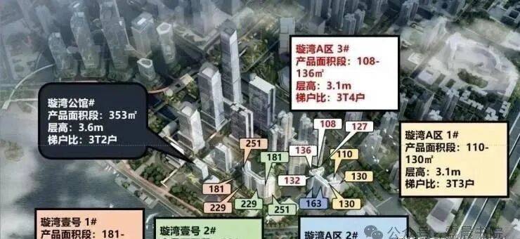 广州滨江上都一期住宅,被命名为璇湾,分为璇湾A区、璇湾B区、璇湾壹号。目前主推A区和壹号,面积段为110—251平的3至5房,其中,130平以上的4房户型才能看到江景。