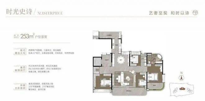 203平是四房两厅三卫户型,竖厅双主套设计,动静分区明显,特点是阳台的270度弧形飘窗非常大气,还有一个独立的空中花园。