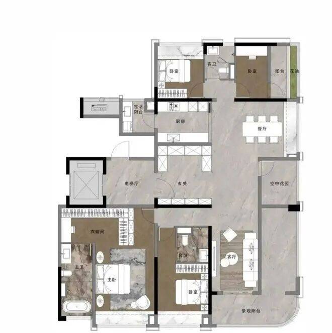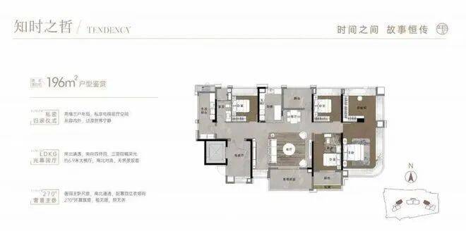 196平是四房两厅三卫户型,竖厅双主套设计,客厅开间将近7米,主卧有一个独立的衣帽间,飘窗比157平更大,更加大气。