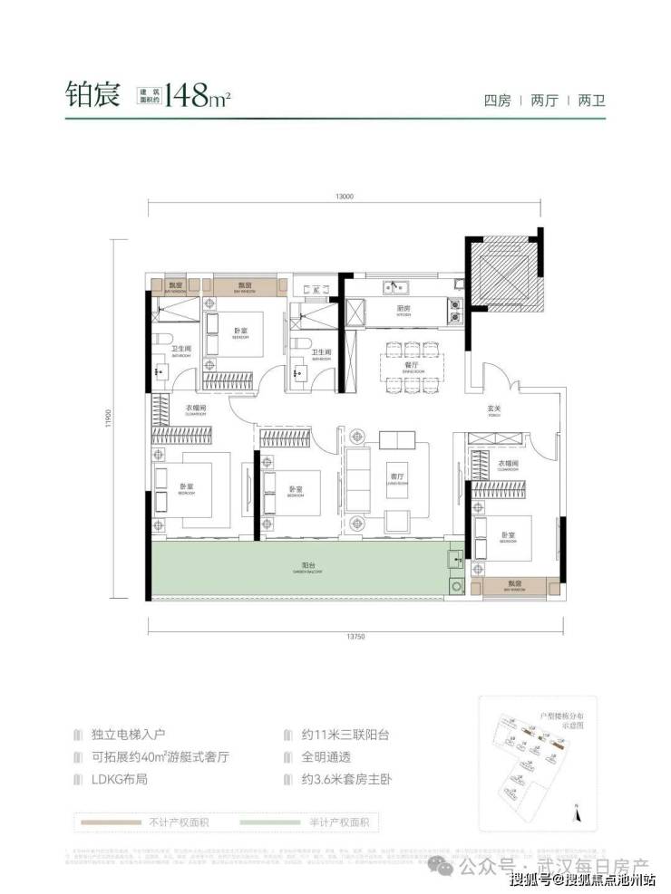 建面约148平洋房,尺度堪比200平豪宅。四开间朝南,南向面宽约13.75米。主卧套房开间约4.2米,豪华感升级。阳台进深约2米,客厅开间约4.5米,南向次卧开间也有3.4米。如果改造的话,还可以做一个超50平家庭厅。