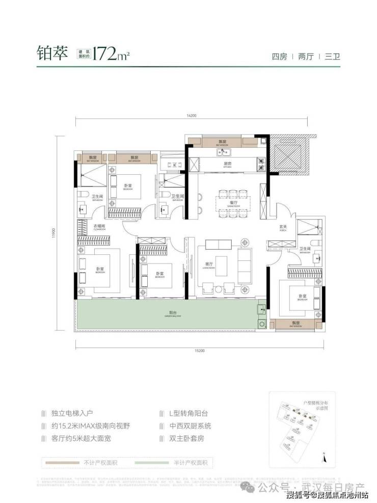 建面约172平洋房,独立电梯入户,约15.2米IMAX南向视野,客厅约5米超大面宽,中西双厨,270°转角阳台,双主卧套房,实在是太豪横。