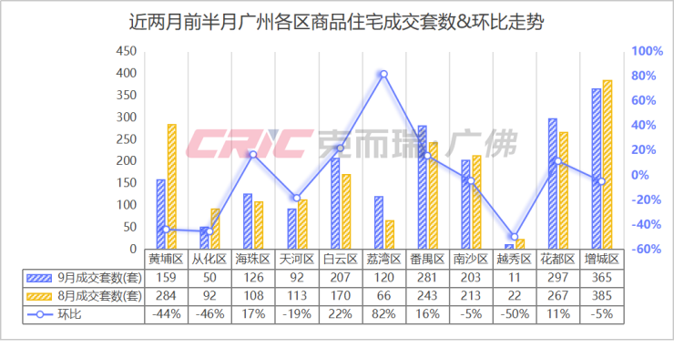 具体到区域表现上看,克而瑞数据监测显示,9月前半月(截至15日)增城、花都、番禺商品住宅成交规模依次位列全市前三。