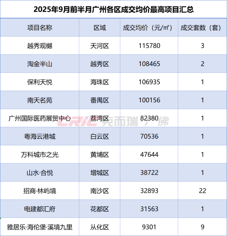 与此同时,克而瑞监测到,9月前半月(截至15日)不少区域项目成交均价最高突破10万+/㎡,最高为越秀观樾,成交均价115780元/㎡。