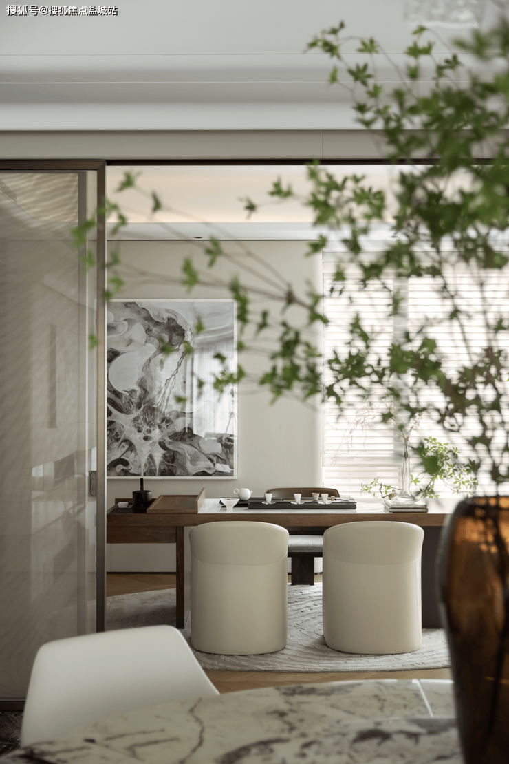 在茶室,设计师选用木美MaxMarko品牌,中式圈椅造型美学辅以天然皮革材质,温润的大理石结合古韵实木,古朴典雅又符合现代美学,在不同材质的碰撞中,探讨当代茶与生活方式的融合。一抹绿意伸展,袅袅烟影落于晴窗,私藏一隅东方雅韵,阅尽书籍的历史厚重感,在茶香与墨香中沉淀生命诗意。