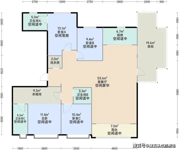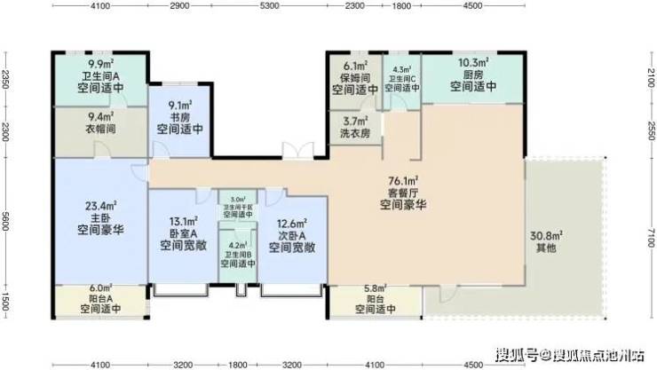 户型产品重点打造跃层户型和大平层户型,项目户型布局舒展,功能齐全,动静分区明确,每个户型设置270°超大广角观景露台。住宅强调墅质空间体验,6米挑高共享空间,超大广角观景庭院,多主卧套房的设计,尽显生活雍容品味;大平层户型分别配置客餐一体大厅,内外环游动线,中西餐厨房,舒适主卧套间,舒适之中尽显优越与尊崇。