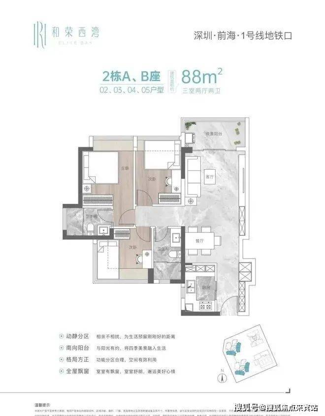 :54-100㎡两至四房,主力为87-88㎡三房,得房率81%以上(部分户型赠送飘窗、阳台)