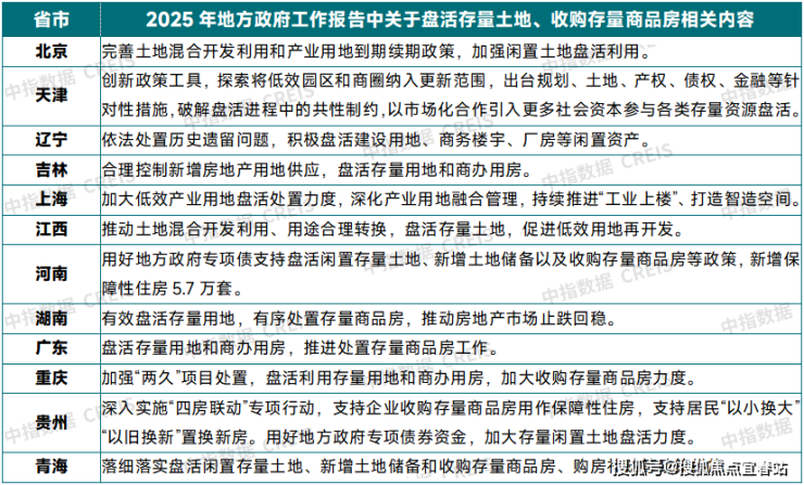 表:2025年部分省市政府工作报告中盘活存量土地、收购存量商品房相关内容表述资料来源:各省市政府工作报告,中指研究院综合整理