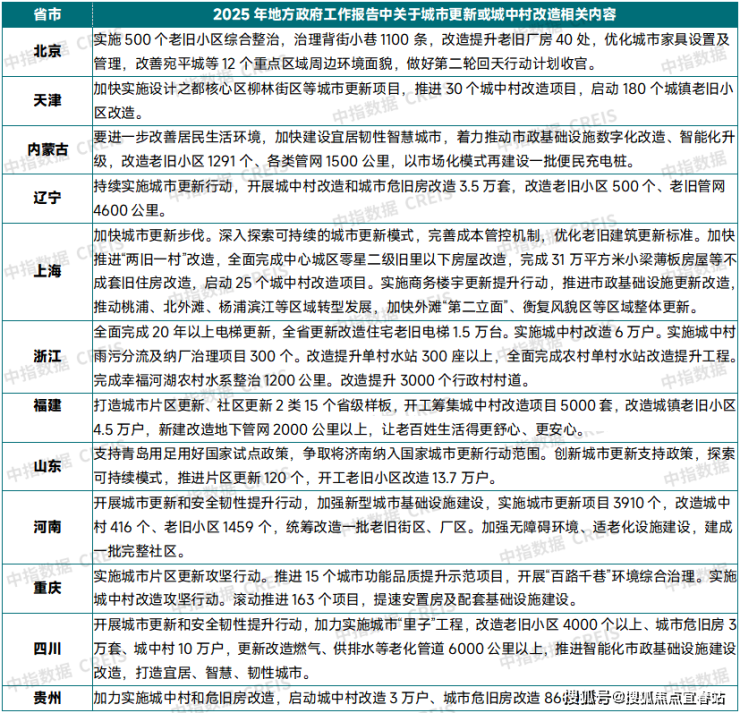 表:2025年部分省市政府工作报告中关于城市更新和城中村改造相关内容表述资料来源:各省市政府工作报告,中指研究院综合整理