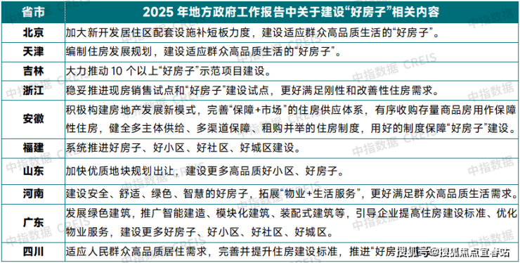 表:2025年部分省市政府工作报告中“好房子”相关内容表述资料来源:各省市政府工作报告,中指研究院综合整理