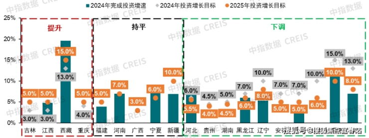 图:19个省(区、市)2024年固定资产投资完成情况及2025年增长目标对比资料来源:各省市政府工作报告,中指研究院综合整理