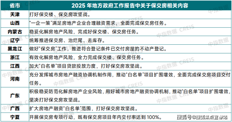 表:2025年部分省市政府工作报告中保交房相关内容表述资料来源:各省市政府工作报告,中指研究院综合整理
