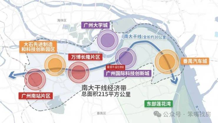 南大干线经济带——番禺黄金财智走廊,是联系珠三角东西岸的重要发展走廊。串联番禺重要经济平台广州南站-长隆万博-国际创新城-汽车城板块,汇聚番禺1900余家中绝大多数高薪技术产业(如希音、欢聚时代、迪士普等巨头),撑起了番禺的经济命脉。