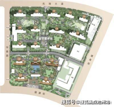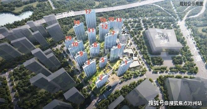 从平面图来看,该项目地块完整方正,所有楼栋朝向与武汉大道走向一致,呈东南朝向,做了并列式布局。项目商业和办公楼分布在地块东侧。