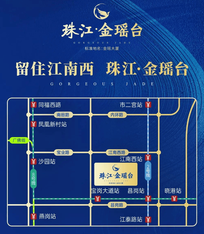 2/8号线双地铁上盖:约280米即达8号线宝岗大道站,20分钟直通达珠江新城;约800米2号线江南西地铁站,可通达广州南站等大型交通枢纽;