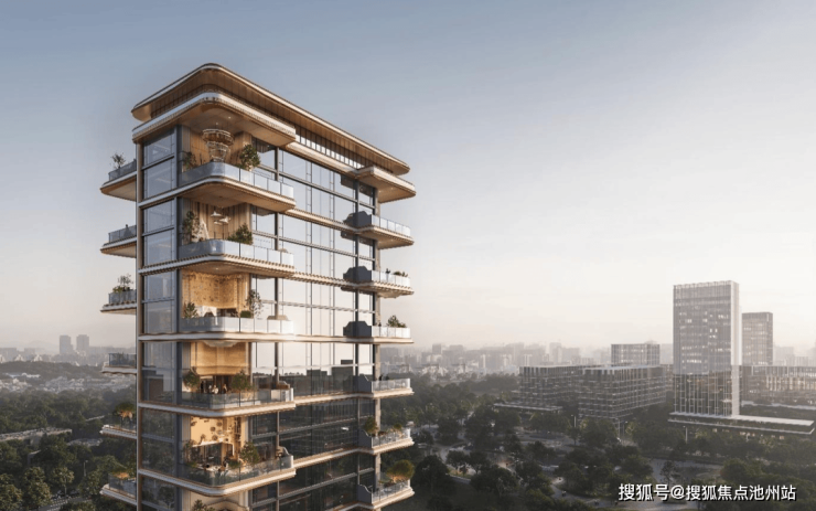 外立面风格为现代,群像天际线对话城市,空间形态对标重庆地标来福士。立面以水为魂、玉出重庆作为概念切入点,提取水与玉的温润元素符号运用到弧形的铝板线条中,类幕墙的设计,大面的玻璃与金属碰撞带来惊艳的精工感。在材质色彩方面,以香槟色对话米白色,正是金风玉露一相逢,便胜却人间无数。