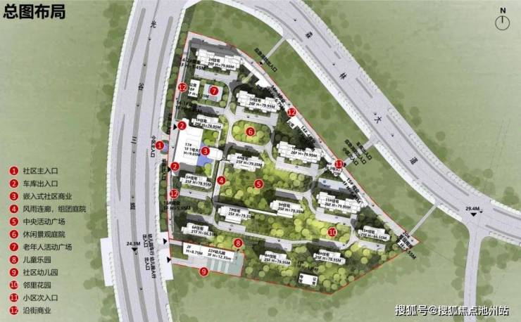 竖向生态界面焕新:采用半地下室“台地设计策略”,衔接西侧商业与东侧地库,减少土方开挖,降低工程难度和成本。车库平进地库,提高安全性和舒适度。住区景观采用四级绿化体系,构建整体面貌。