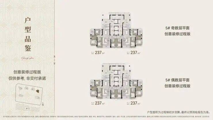 「保利玥玺湾」小区是半围合式结构,面积段是203-222-227-237-273-347-411-436-630㎡大平层,样板间能看的有三个237-347㎡的。