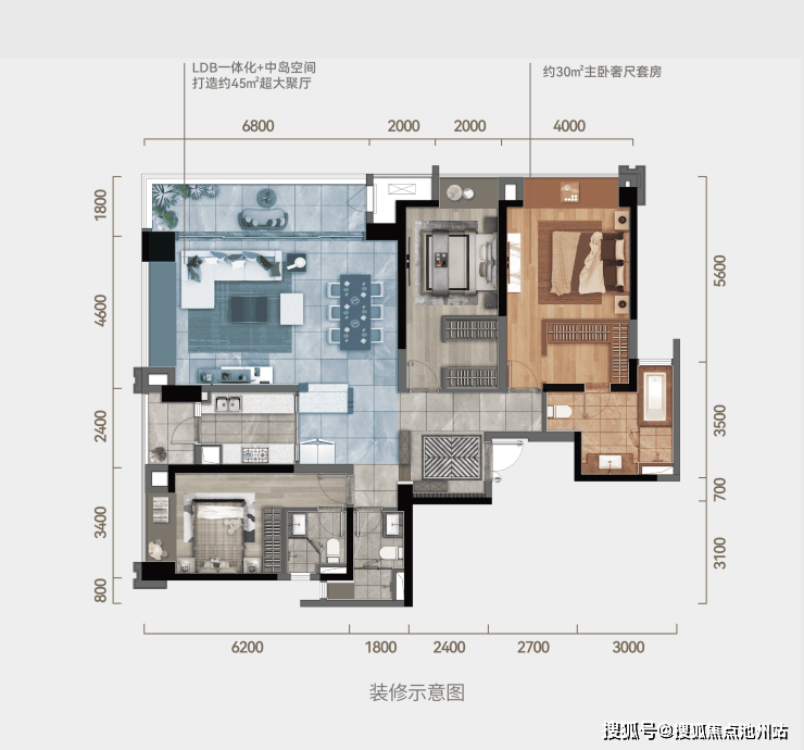 【E户型 三室两厅三卫】 套内约147㎡ 建面约182㎡此户型采用LDB一体化与中岛空间设计,打造出约45㎡的超大聚厅。拥有270°环幕视野和约6.8米的景观阳台。双套房设计,其中奢阔的主卧套房面积约30㎡。