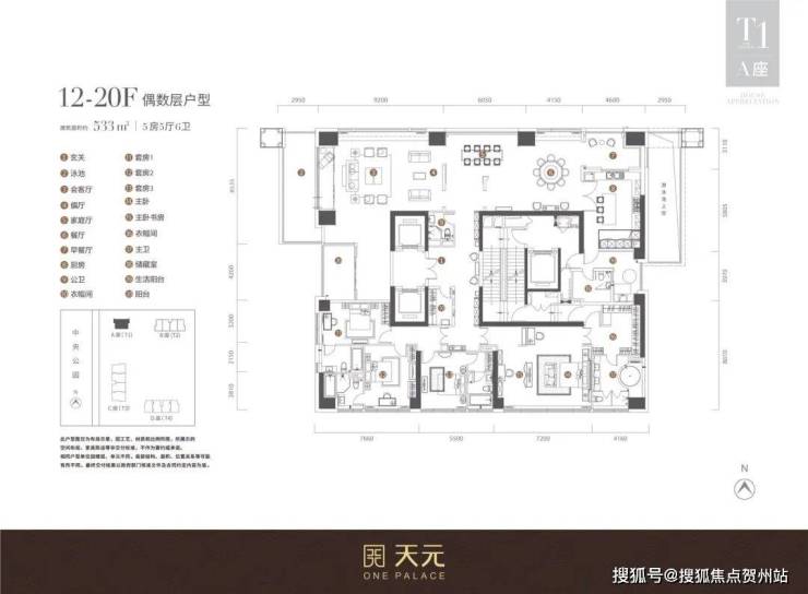 12-20F偶数层户型:533平,五房五厅六卫,南北通透