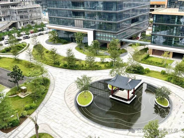 商务配套中式园林景观、10米挑高大堂、全景节能玻璃幕墙
