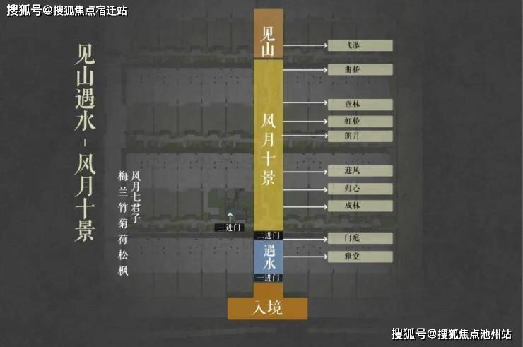 中国人自古讲究归家礼序,门第之尊;久映颂月将传统中式建筑的礼序空间融入整体的规划布局中,形成一坊八巷-置坊入巷-穿巷入户的三重归家礼序。