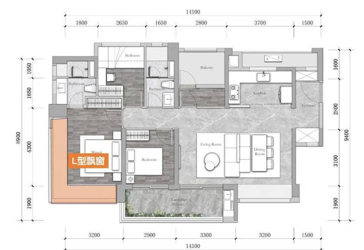 建面约90平2+1房朝向东南,四开间南向,主卧对流总价420万左右