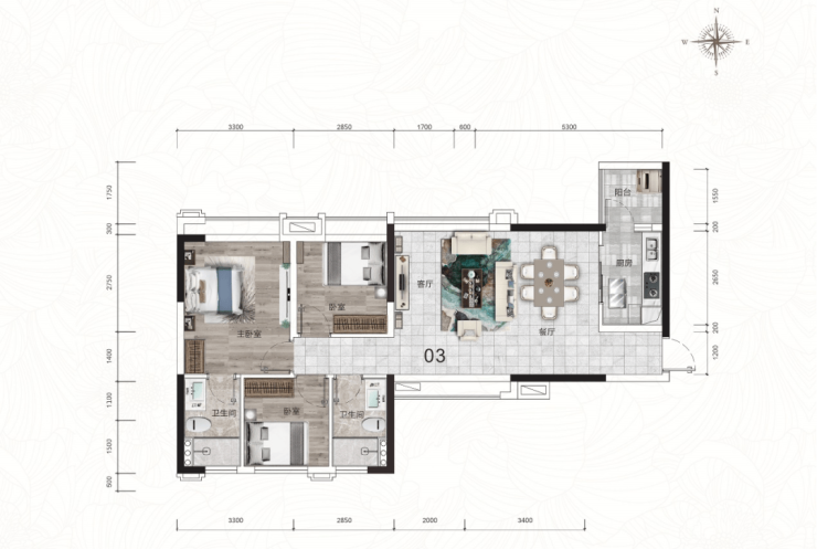 三房两卫超大空间利用率,灵活满足不同阶段的居住需求。