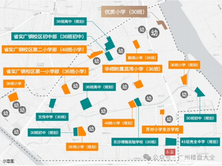 3、教育:项目自身只配建了一所幼儿园,小学根据政策周边的学校,周边有东沙小学、新东小学以及广钢南区的华附荔湾小学等,具体读哪个就看交楼后教育部门的划分了。