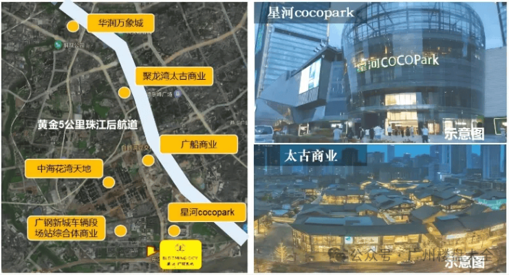 2、商业:小区一路之隔即为广州国际医药港,引进了约 12 万㎡的星河 cocopark,未来居民下楼即可享受逛街消费的便利。