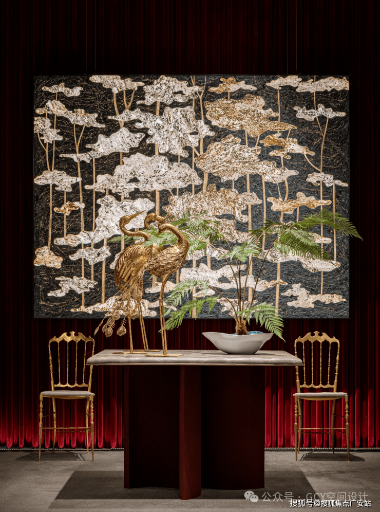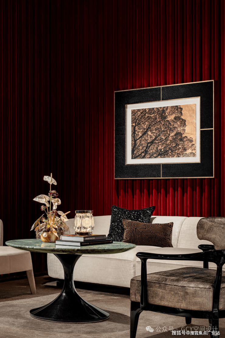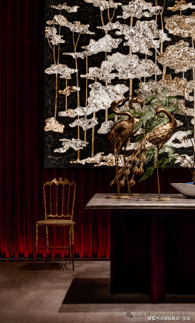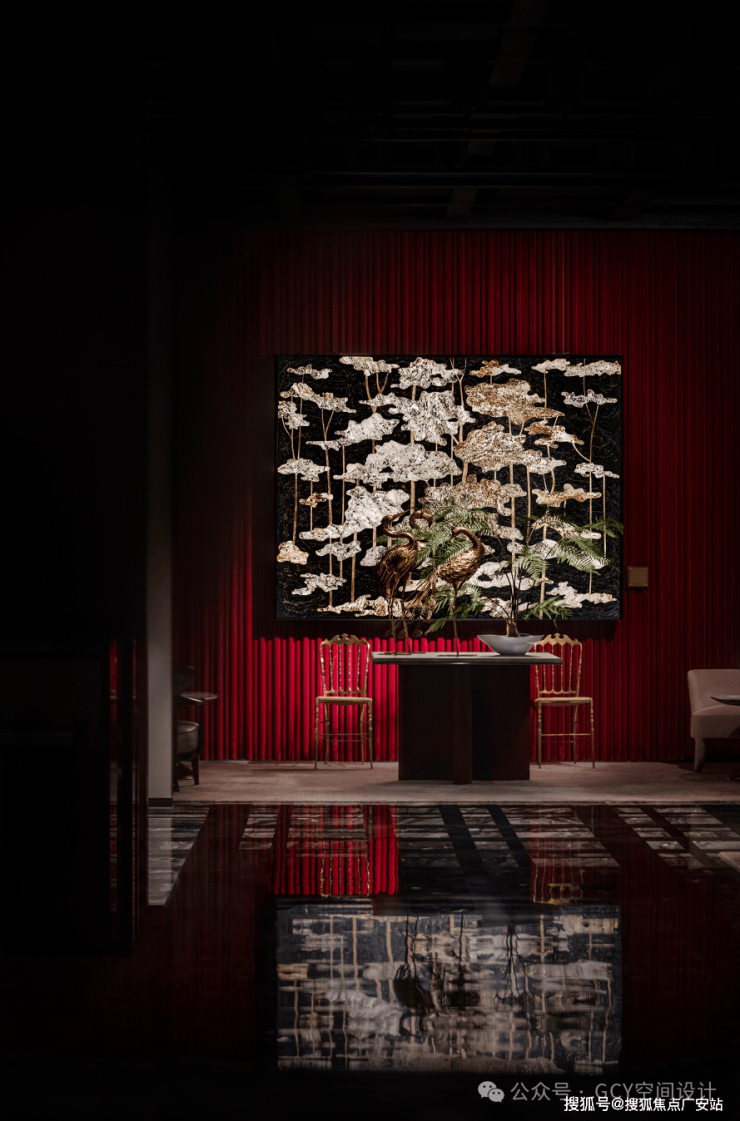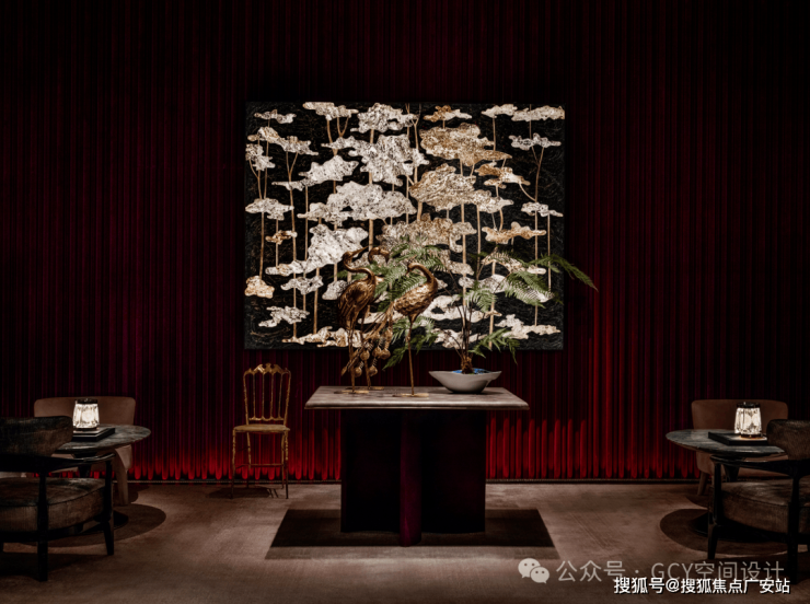 红色丝绒幕布质感奢华,与艺术画作、金属椅的色调相呼应,提升了空间的奢华氛围。