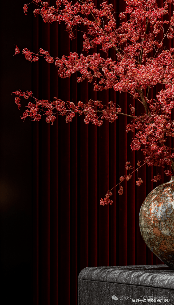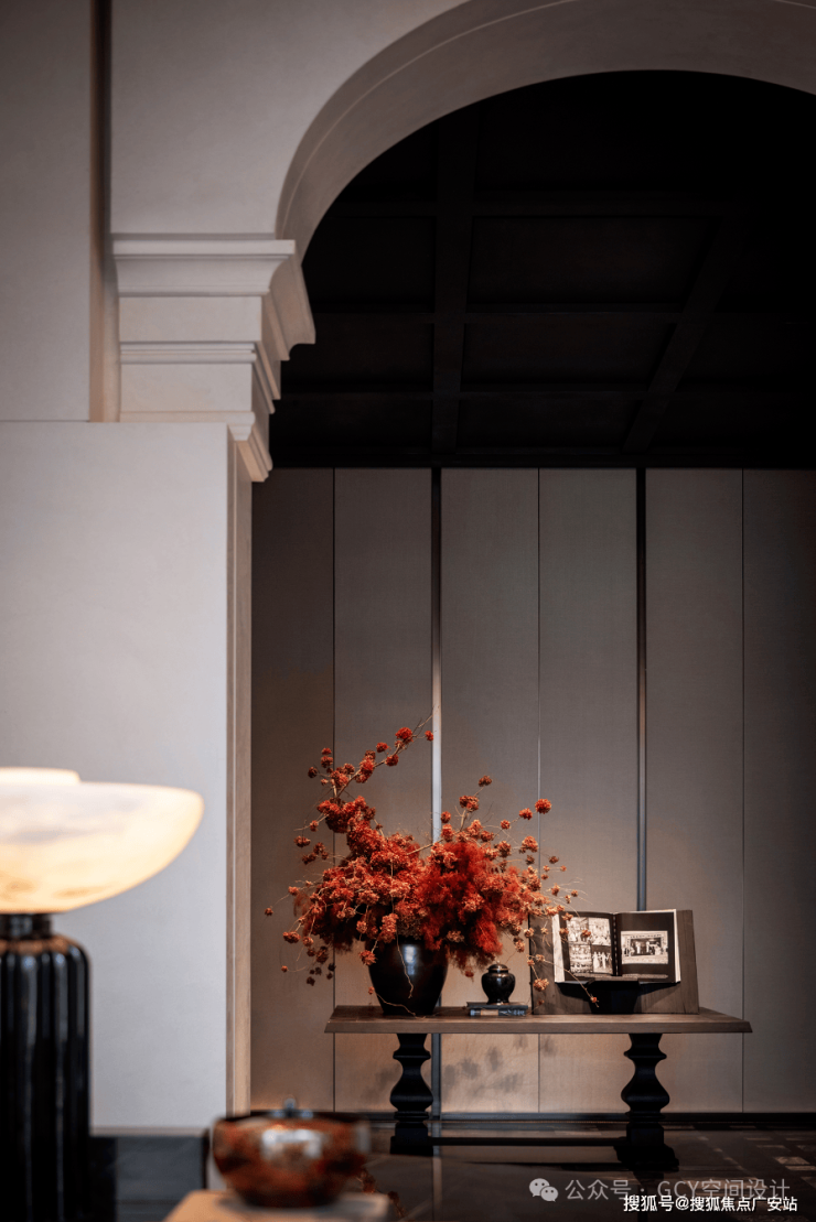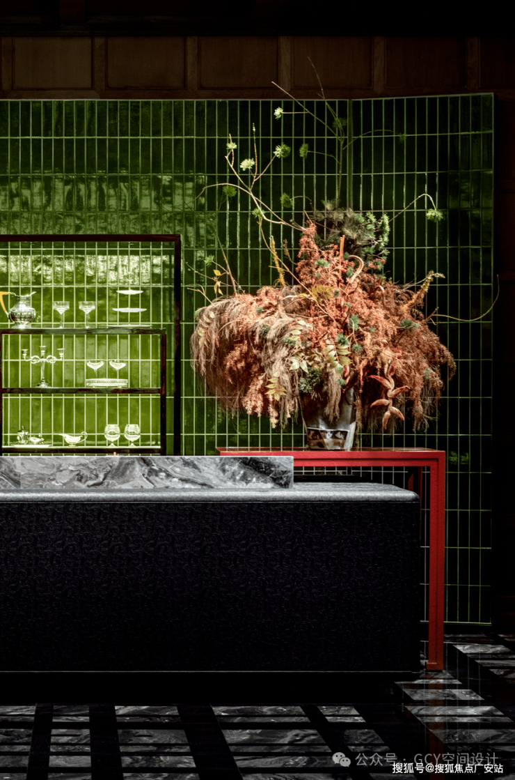 在绿色的背景墙前特意用互为补色的红色,以条几台面形式出现,陈设了大型艺术花艺,花材丰富且造型极具艺术感,与深色花瓶搭配,成为空间的视觉焦点。