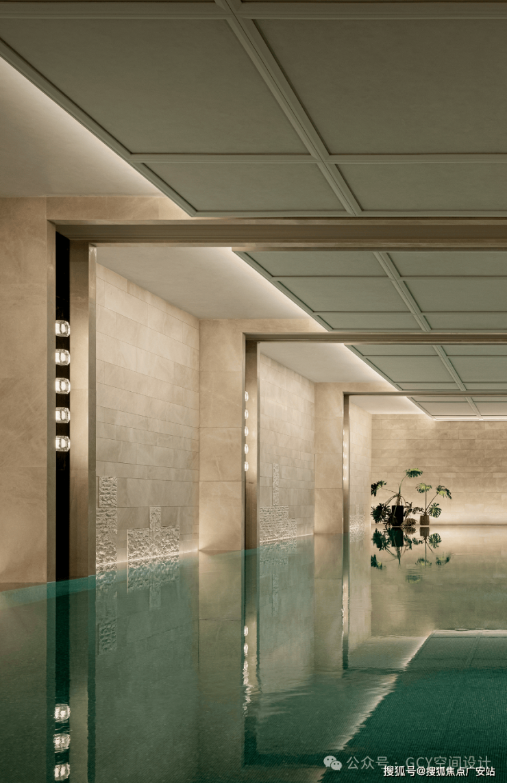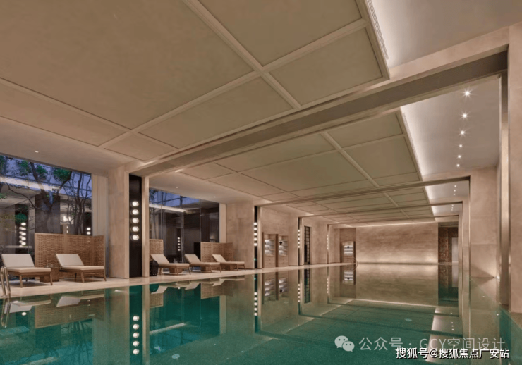 池水清澈,镜面效果明显,空间纵深感强,满足游泳与视觉享受的双重需求。格栅造型天花板搭配嵌入式灯光,光线柔和且均匀,营造出静谧雅致的氛围。以浅色系石材为主,搭配大面积玻璃门窗,引入室外绿植景观,实现了室内外空间的自然融合。池边摆放的休闲躺椅,设计简约舒适,为游泳后的休憩提供了便利,提升了空间的功能完整性。